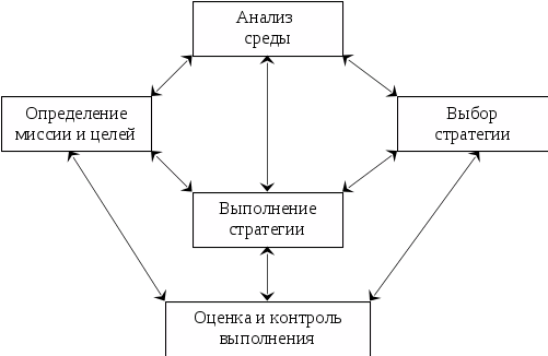 Стратегическое управление можно рассматривать как динамичен кую совокупность пяти взаимосвязанных управленческих процессов. Эти процессы логически вытекают (или следуют) один из другого. Однако существует устойчивая обратная связь и, соответственно обратное влияние каждого процесса на остальные и на всю их совокупность. Это является важной особенностью системы стратегического управления. Схематически структура стратегического управления изображена на рис. 1.