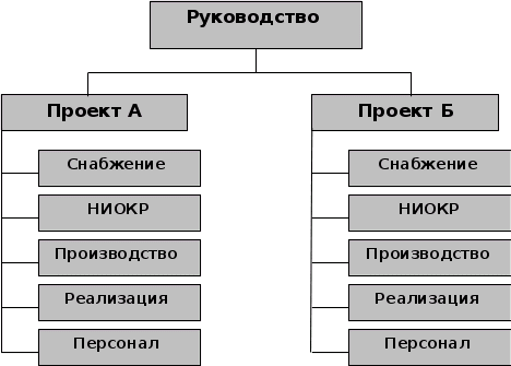 При такой структуре устанавливается разделение прав менеджеров, осуществляющих управление подразделениями, и менеджеров, руководящих выполнением проекта, и важнейшей задачей высшего руководящего состава компании в этих условиях становится поддержание баланса между двумя организационными альтернативами.
