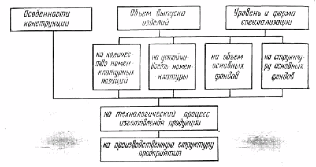 Применяемая технология является одним из важнейших факторов, определяющих производственную структуру предприятия. Так, наличие большого числа деталей, изготовляемых из поковок, требует организации самостоятельного кузнечного цеха; большая потребность в оригинальных крепежных деталях специальной конструкции предопределяет необходимость выделения автоматного цеха и т. д.
