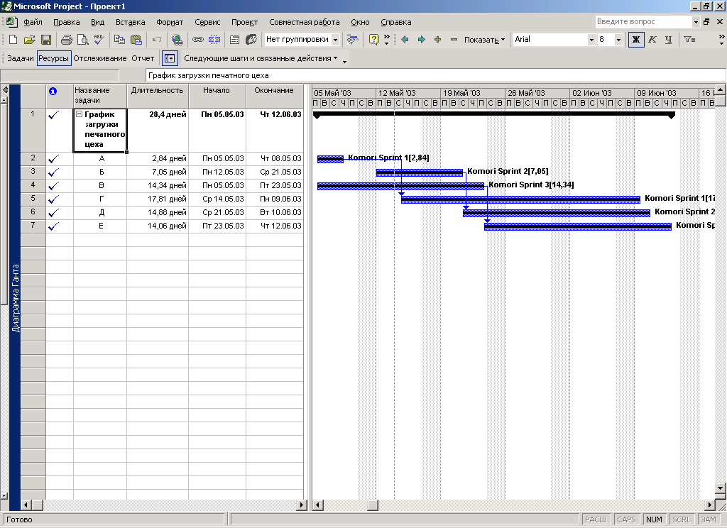 Для выполнения графика плана-загрузки необходимо установить параметры проекта: длительность работ, назначить используемые ресурсы, способ планирования, вид связи работ, приоритет работы, календарь рабочего времени, единицы измерения длительности и объем работ. Предположим, что на предприятии имеется достаточное количество оборудования для печати одного вида издания на одной офсетной печатной машине Komori Sprint 226. Тогда, срок исполнения всех заказов при двухсменном режиме работы будет равен 17,81 дней, при этом будет задействовано 6 единиц оборудования и 12 печатников офсетной печати: 6 печатников VI разряда и 6 печатников офсетной печати IV разряда, отсюда следует, что коэффициент загрузки производственного оборудования будет низким.