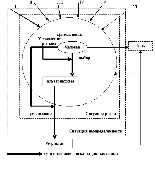 На рисунке 1 изображена схема риска. Помимо самого человека на его деятельность влияют факторы I, II, III, IV, V, VI, создающие в ней ситуации неопределенности и риска. Действия и решения человека могут повлиять как в лучшую сторону на результаты деятельности, так и в худшую, разрядить ситуацию неопределенности, изменить цель проекта. Риск существует как на этапе выбора действий (принятия решений), так и на этапе реализации проекта.
