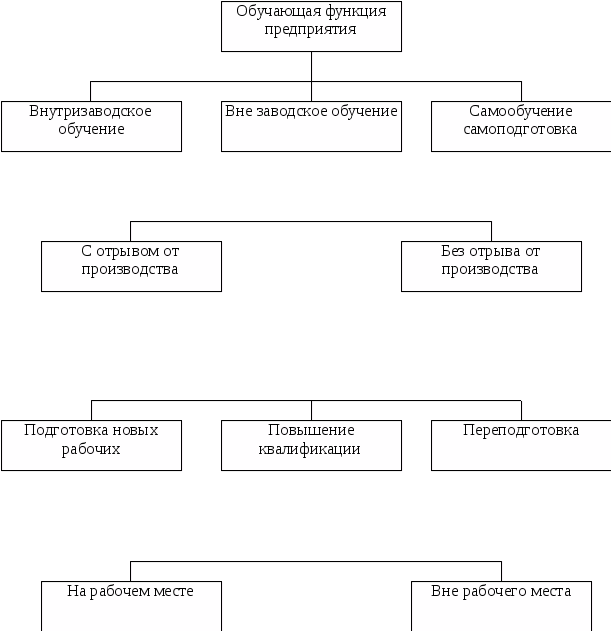 Обучающая деятельность предприятия представлена достаточно разнообразными ее видами (рис. 1.1.). Прежде всего, обращает на себя внимание, что обучение может быть организовано непосредственно на предприятии собственными силами. Во вне заводском обучение роль предприятия сводится к определению требований не только к количеству, но и к направленности обучения, закрепленных в соответствующих договорах на подготовку. Само обучение осуществляется в специально обучающих центрах, а также в системе высшего и среднего специального образования.