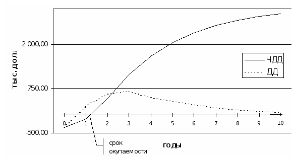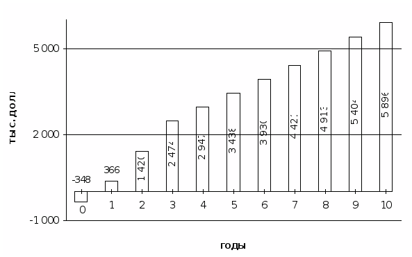 Срок предпроектной подготовки установлен до 01 июля 2002 года. Срок реализации проекта составляет 10 лет, а окупается он в первый год своей реализации. При этом требуются единовременные затраты в размере 348 тыс.долл., но в результате реализации проекта чистый дисконтированный доход составляет 2 853,25 тыс.долл. при коэффициенте дисконтирования 55 %. При этом внутренняя норма доходности составляет 230 %, а среднегодовая рентабельность 74,5 %, при индексе доходности 9,2.