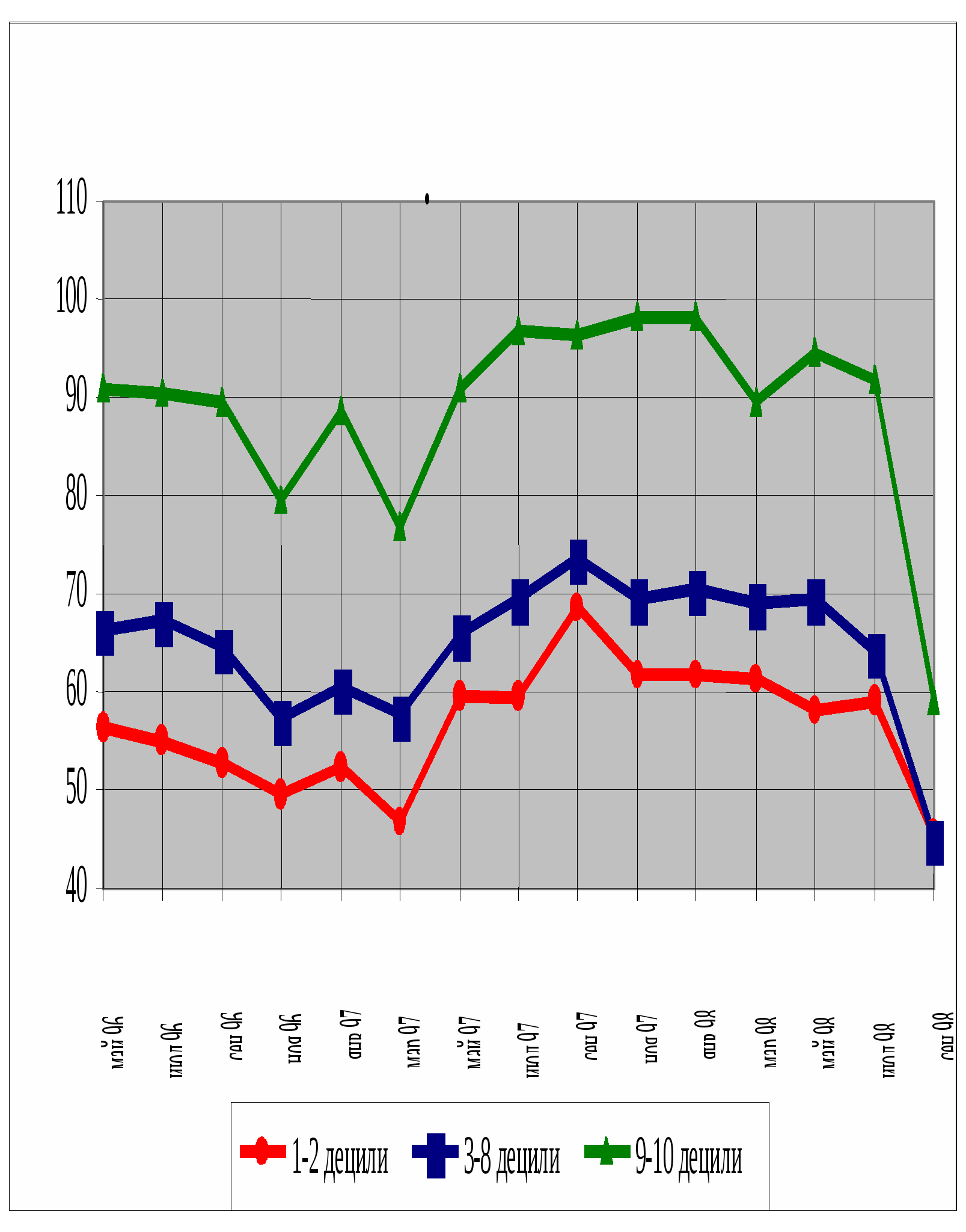 В связи с уменьшением доходов на душу населения шестая-девятая децили уменьшили свою долю примерно на 5 пунктов. Седьмая дециль, включающая население стран со средним уровнем дохода, главным образом страны Латинской Америки, потеряла примерно 1 пункт. В девятой дециле сосредоточено население нефтеэкспортирующих стран, их доля в мировом доходе сократилась на три пункта — с 27 до 24%.