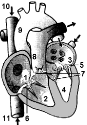1 — правое-, 3 — левое предсердия; 2 — правый-, 4 — левый желудочки; 5 — двух-, 6 — трехстворчатый клапаны; 7 — полулунные клапаны; 8 — легочная артерия; 9 — левая дуга.