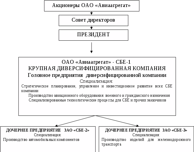 Одна из основных особенностей управления ОАО «Авиаагрегат» состоит в том, что фактически многопрофильное предприятие по структуре управления в настоящее время ориентировано на централизованное управление разнородными производствами и на общее производственно-технологическое развитие всей бизнес-системы.