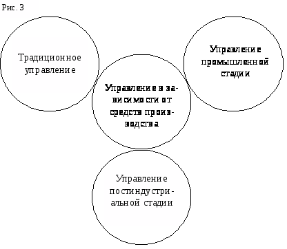 Во – первых, состояние развития управления находится в сильной зависимости от уровня развития производственных сил. В зависимости от уровня развития средств производства выделяется три типа управления: (рис 3).