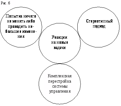 б) стереотипный подход к решению возникающих задач. Это попытка решать любые управленческие задачи практически независимо от их содержания, природы и динамики с помощью ранее оправданных себя подходов к преобразованию системы управления.