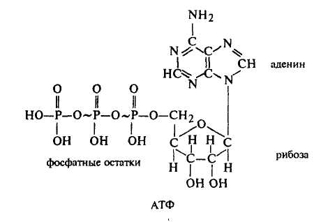 Аденозинтрифосфорная кислота (АТФ) состоит из органического основания аденина (I), углевода рибозы (II) и трех остатков фосфорной кислоты (III). Соединение аденина и рибозы называется аденозином. Пирофосфатные группы имеют макроэргические связи, обозначенные значком ~. Разложение одной молекулы АТФ с участием воды сопровождается отщеплением одной молекулы фосфорной кислоты и выделением свободной энергии, которая равна 33—42 кДж/моль. Все реакции с участием АТФ регулируются ферментными системами.