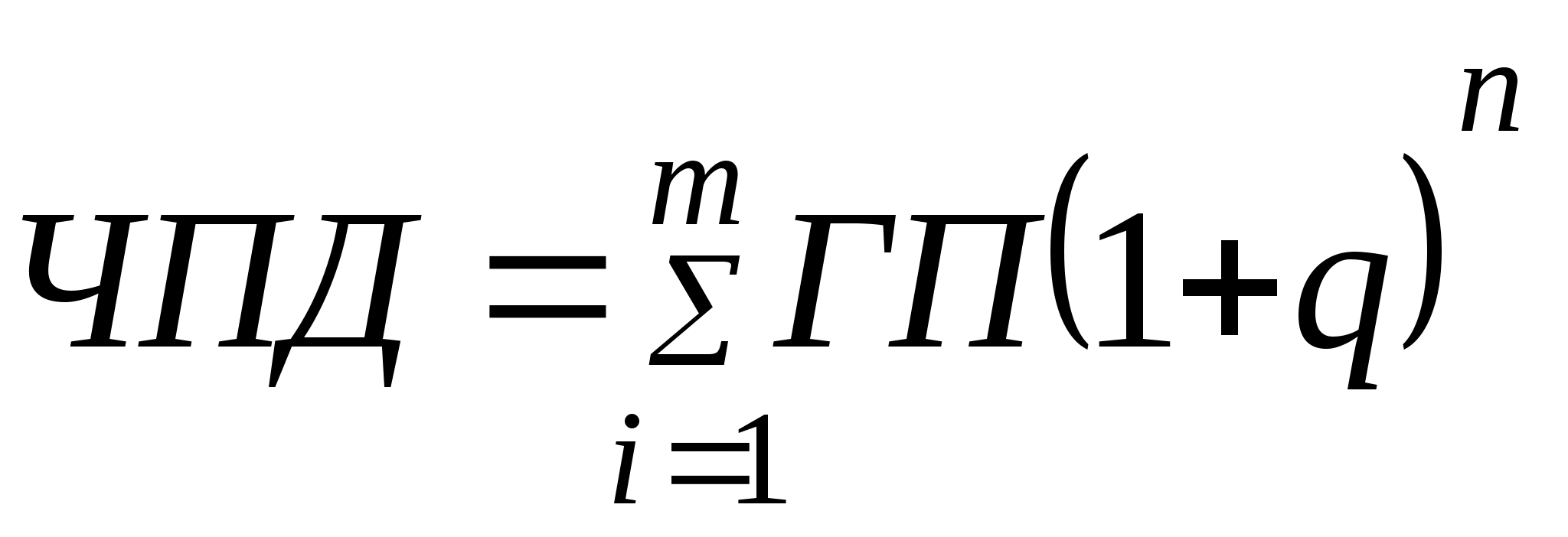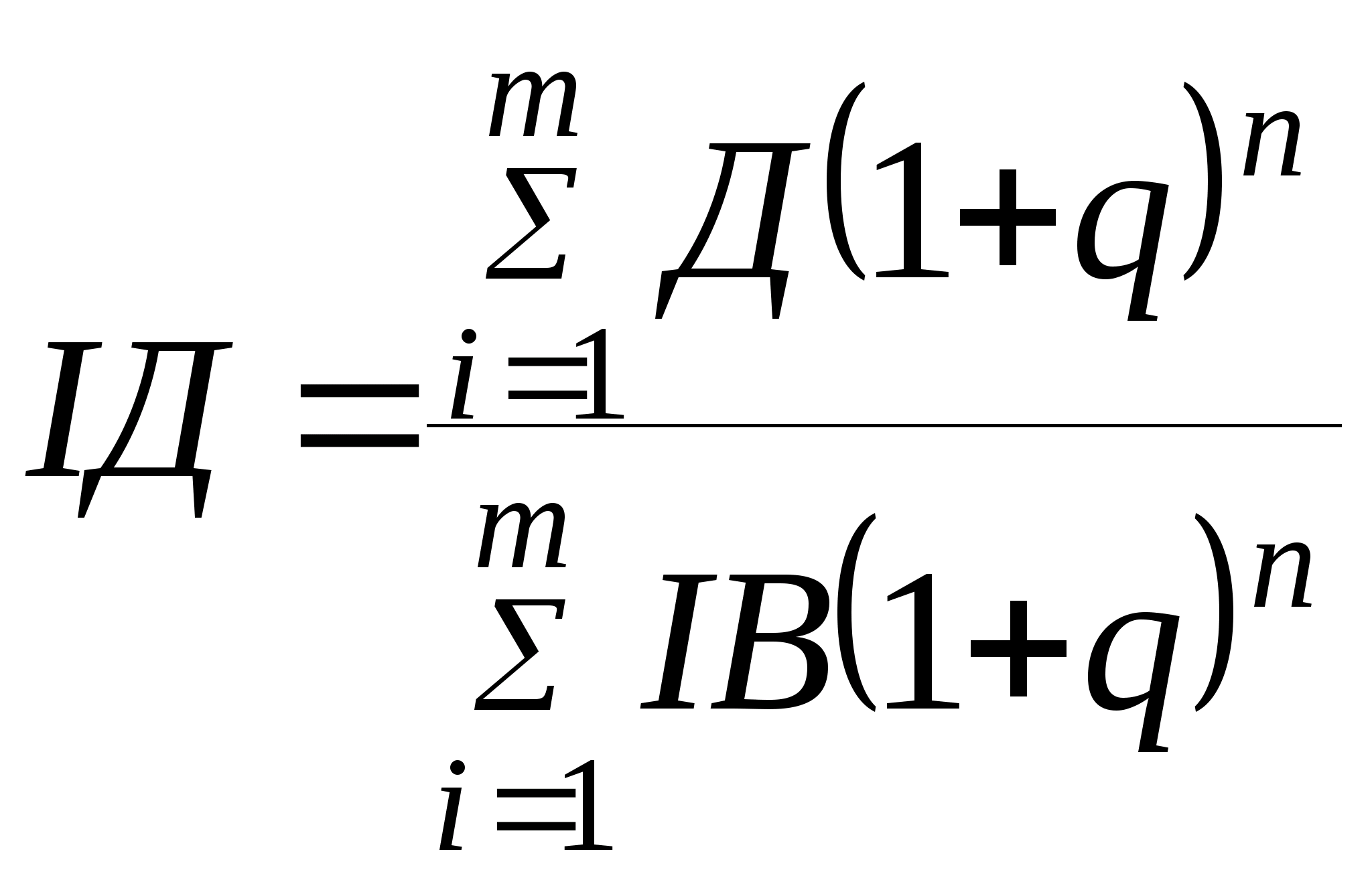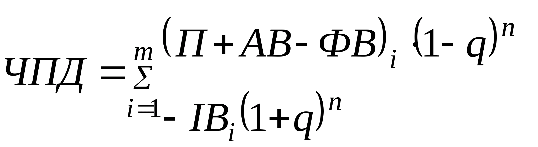 де П — прибуток; АВ — амортизаційні відрахування; ФВ — фінансові витрати (відсоток за користування кредитом); ІВ — інвестиційні витрати; q — ставка дисконту або необхідна ставка доходу; i — порядковий номер року розрахункового доходу; m — розрахунковий період роки; n — кількість років, що відокремлює витрати (результати) конкретного року від розрахункового. |