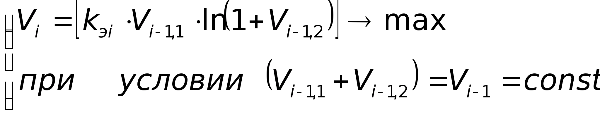 где n - число поставок, S - удельные издержки по поставкам, С>Т>-удельные издержки хранения ресурсов на складе,V>i>(t>i>>-1>) - объемы поставок, t - моменты поставок. Причем, запись V>1>(t>0>) означает, что первая поставка объемом V>1> осуществляется в начале интервала Т, т.е. в момент t>0> , а V>2>(t>1>) означает, что вторая поставка размером V>2> осуществляется в следующий момент времени t>1> и т.д. Поскольку очередная поставка осуществляется в момент, когда уровень запаса понизится до нуля, то имеет место соотношение