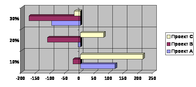 Предполагаем, что изменение стоимости денег со временем может иметь место в трех вариантах и потребует дисконтирования со ставкой 10%, 20% и 30%.
