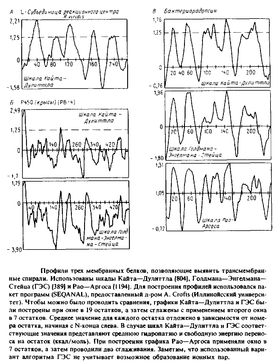 На рис. приведены два профиля для цитохрома Р450 из микросом. Этот белок был выбран потому, что данные о его первичной структуре позволяют высказать предположение о наличии у него восьми трансмембранных спиралей. Однако имеющиеся экспериментальные данные указывают на существование только одного N-koh-цевого якоря в мембране. Как профиль Кайта–Дулиттла, так и профиль Голдмана–Энгелмана–Стейца выявляют N-конце-вой участок, но они указывают и на наличие одного или более дополнительных трансмембранных сегментов, что не соответствует действительности. Отметим, что многие из построенных моделей мембранных белков, которые основываются лишь на данных об аминокислотной последовательности, могут быть некорректными.