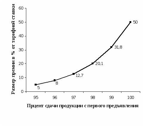 Таким образом, при оплате заработной платы рабочих будет использоваться повременная система оплаты труда, а также система премирования. Поскольку простая повременная оплата труда недостаточно стимулирует рабочих к достижению высоких показателей труда, то была разработана шкала премирования за уровень сдачи продукции с первого предъявления.