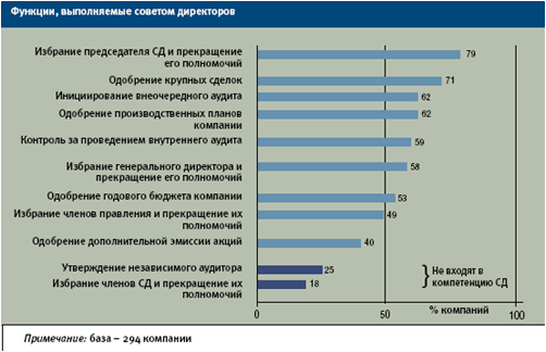 Такая ситуация была описана в исследовании, проведенном по заказу проекта IFC <Корпоративное управление в России> в 2002 г.16, и наиболее ярко смешение функций отразилось на диаграмме, иллюстрирующей функции совета директоров (см. рисунок). Необходимо подчеркнуть, что исходные данные были получены в ходе опроса руководителей компаний. Информация, полученная специалистами проекта в ходе консультаций и анализа внутренних документов акционерных обществ, также свидетельствует о том, что многие СД тратят значительно больше времени на решение оперативных проблем, чем на обсуждение вопросов стратегического управления. Акцент на руководстве текущей деятельностью выражается, как правило, в том, что СД принимают краткосрочные (максимум на 1 год) бюджеты или планы развития. Более того, одобрение и этих документов часто становится формальностью, так как заседания СД длятся не более полутора часов, что явно недостаточно для качественного обсуждения даже относительно простого годового бюджета.