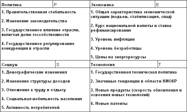 Цель PESTанализа (Р - Political legal - политико-правовые, Е - Economic - экономические, S - Sociocultural - социокультурные, Т - Technological forces - технологические факторы) - выявление и оценка влияния важнейших факторов макросреды на результаты текущей и будущей деятельности предприятия. При этом устанавливаются события, не подконтрольные предприятию, но влияющие на результаты хозяйствования.