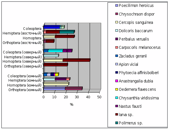 Объектом исследования явились насекомые урочищ ландшафтов различных видов экотона высокогорий Западного Кавказа, в частности Orthoptera, Hemiptera и Homoptera и Coleoptera.