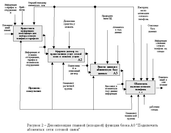 На рисунке 1 представлена, в качестве примера, функционально-структурная модель бизнес-процесса “Подключить нового абонента к сети сотовой связи, а на рисунке 2 - декомпозиция главной (исходной) функции блока А0 данного бизнес-процесса.