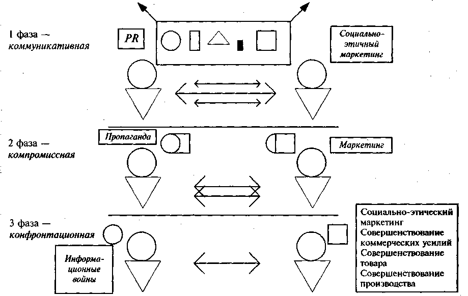 К сожалению, ни PR, ни социально-этичный маркетинг (как и общественное согласие) не могут возникнуть в более ранних фазах конфликта. Поэтому наш маркетинг, как правило, — «боевой», PR — «черный», а реклама — инструмент манипуляции потребителем.