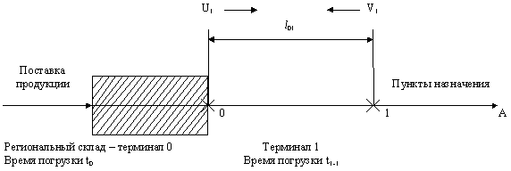 Существуют различные стратегии обеспечения материальными ресурсами различных предприятий. Одной из таких стратегий является модель, которая состоит из регионального склада и нескольких терминалов. Рассмотрим эти модели. Иллюстрация модели с одним терминалом приведена на рис. 8.3, а модель с двумя терминалами показана на рис. 8.4.
