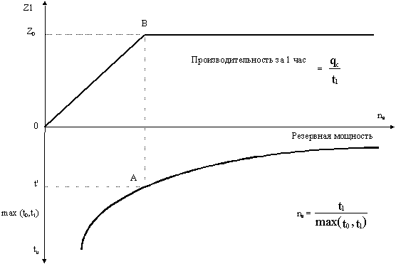 Точка А на рис. 8.5., в которой кривая достигает горизонтальной поверхности, соответствует ситуации, когда дальнейшее увеличение числа транспортных средств в рамках рассматриваемой системы приведет не к возрастанию объема перевозок, а лишь к возрастанию резервной мощности системы перевозок.