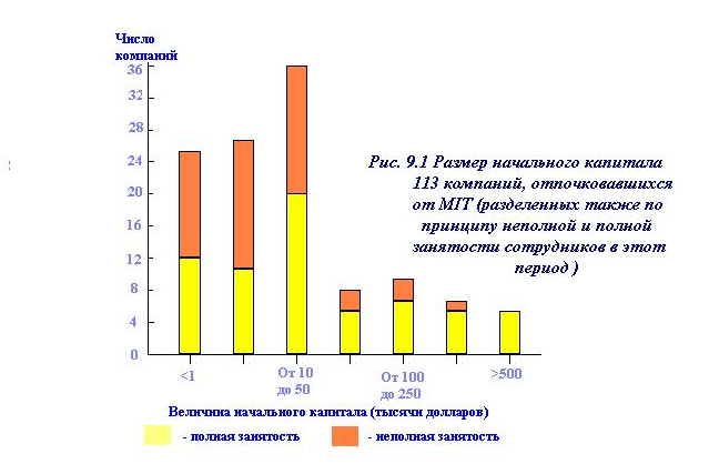 Как следует из рис.1, построенного по результатам выполненного MIT (Roberts) обследования 113 фирм, 23% этих компаний начинала с “инвестиций”, не превышающих одной тысячи долларов, почти половина - с менее 10 тысяч, только 22% (25 компаний) имели начальный капитал в 50 и более тысяч долларов, причем 20 из этих 25 сразу стартовали с отрывом сотрудников от предыдущего места работы, на условиях полной их занятости.
