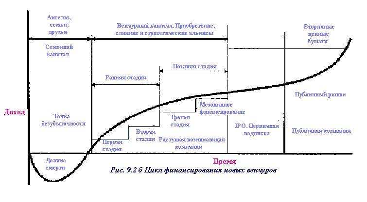 Принимая инвестиционные решения, каждый из этих источников соотносит неопределенные риски неудач, предположительно связанные с конкретной фазой развития предприятия, и неопределенные перспективы финансовой отдачи. Эмбрион технологического предприятия принципиально отличается от большинства других новых фирм. Помимо специфики технологического рынка и высокого риска, связанного с выведением технологического продукта на рынок, на этой ранней стадии у стартующих предприятий нет также никаких осязаемых активов, как нет и осязаемых мер уровня совершенства их продуктов. Активы многих стартующих технологических компаний нередко ограничиваются осциллоскопом, паяльником или даже лупой, а еще чаще только некоторой интеллектуальной собственностью. При таких залогах поиск кредитов или инвестиций в банках либо других традиционных финансовых источниках, как правило, бесполезен. Именно на этих стадиях начального финансирования только что созданных фирм на ум часто приходят условия венчурного финансирования, хотя большинство венчурных капиталистов и особенно в Европе предпочитают более поздние стадии устойчивого роста.