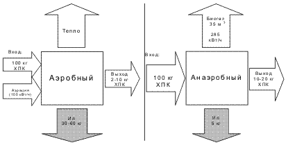Рис. 1.1. Сравнение материального и энергетического балансов методов аэробной и анаэробной очистки сточных вод.