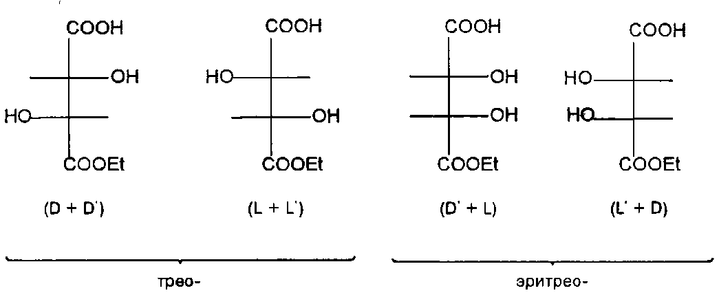 Молекула винной кислоты, образующаяся в процессе брожения виноградного сока, имеет два асимметрических центра, а так как каждый из них может иметь D- и L-конфигурации, то это соединение принципиально может образовать уже четыре конфигурационных изомера:,, и. Так как в молекуле винной кислоты оба асимметрических центра имеют одинаковое окружение и собственно одинаковое вращение, т.е. D=D' и L=L\ то изомеры и идентичны между собой и оптически неактивны. Фактически молекула этой конфигурации имеет плоскость симметрии и молекулярная асимметрия в ней исчезает. Такой изомер, представляющий собой как бы внутримолекулярный рацемат, называют мезоформой. Этерификация одной карбоксильной группы мезоформы винной кислоты приводит к нарушению симметрии молекулы и, соответственно, к возникновению оптической активности у изомеров и.