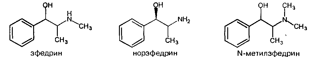 Производными в-аминоспиртов являются алкалоиды семейства эфедро-вых — эфедрин, норэфедрин, Н-метилэ-федрин. Среди них наиболее известен эфедрин, используемый в медицинской практике в качестве сосудосуживающего и бронхорасширяющего средства, его применяют при лечении аллергических заболеваний, а также как стимулятор центральной нервной системы и при отравлении некоторыми наркотиками, так как он является их антагонистом.