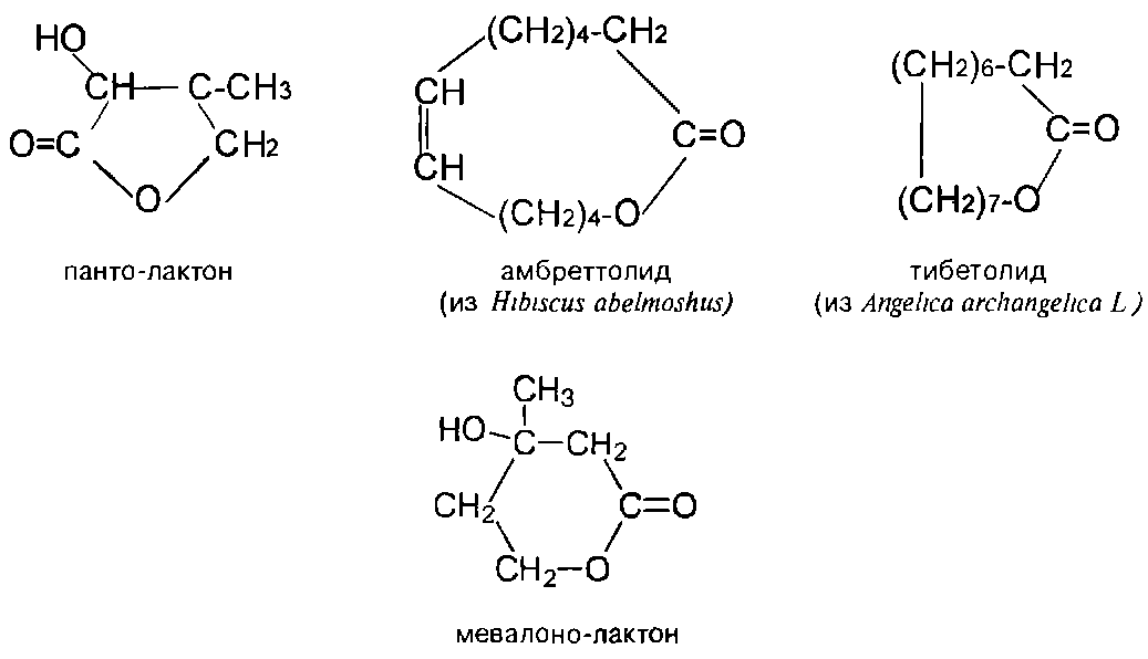 Часто лактонная форма для г-окси-кислот является даже более выгодной, чем оксикислотная, и г-оксикислоты самопроизвольно переходят в циклическую форму. Это характерно для таких известных соединений этого класса как пантовая кислота, многие сескви-терпены. Стабильными макроцикличес-кими лактонами представлены некоторые антибиотики и длинноцепочечные оксикислоты из группы мускусов; легко образует лактон и мевалоновая кислота.
