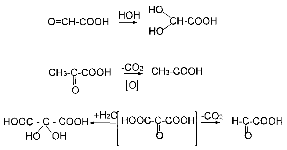 В случае б-оксокислот можно отметить легкость присоединения нуклео-фильных реагентов по карбонильной группе и легкость реакций декарбоксилирова-ния — пировиноградная кислота в условиях окислительного ферментатив-но катализируемого декарбоксилиро-вания образует уксусную кислоту. Мезоксалевая кислота сочетает в себе легкость протекания обоих этих процессов — она существует только в виде гидратированного аддукта и в водном растворе легко разлагается на глиоксалевую кислоту и двуокись углерода.