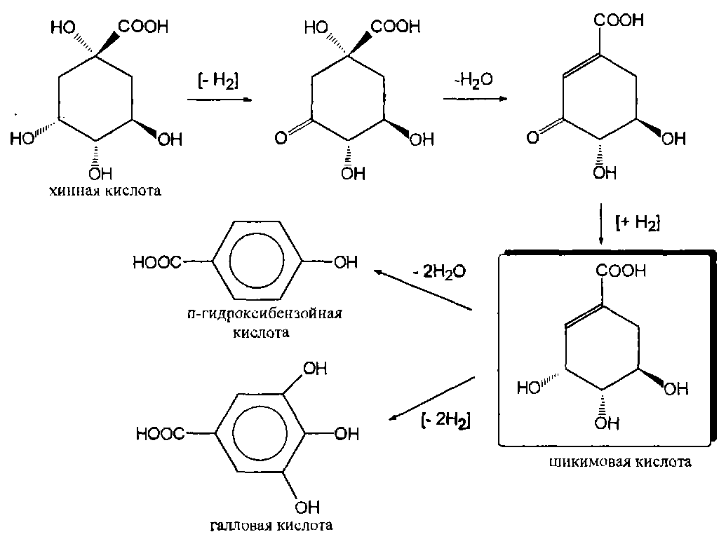 Хинная кислота, являясь исходным соединением биосинтеза ароматических кислородсодержащих соединений, может накапливаться в некоторых растениях в заметных количествах. Но основное предназначение этой кислоты — образование шикимо-вой кислоты, ключевого интермедиа-та вышеуказанных синтезов, с последующим переходом к бензольным производным, используя реакции дегидратации и дегидрогенизации.