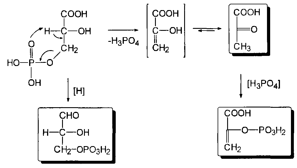 Глицериновая кислота в этих условиях обычно фигурирует в виде 3-фосфата, т.е. она избирательно этерифицируется фосфорсодержащими реагентами в присутствии ферментов по первой спиртовой группе. На следующем этапе 3-фосфат глицериновой кислоты элиминирует фрагмент фосфорной кислоты, образуя а-гидрокси-акриловую кислоту, которая сразу же изомеризуется в пировиноградную кислоту.