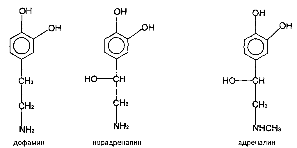 Аминоспирты животного происхождения представлены катехоламинами, осуществляющими регуляцию функций эндокринных желез и передачу нервных импульсов. В первом случае они рассматриваются как гормоны, во втором случае — как нейромедиаторы. Соединения этой группы, кроме спиртового гидроксила, имеют еще и фенольные функции. Биогенные катехоламины представлены тремя соединениями: дофамин, норадреналин, адреналин.