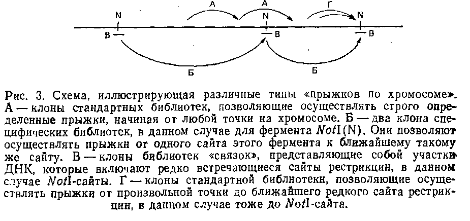 Следует разграничить понятия стандартных геномных библиотек для «прыжков по хромосоме» и специфических библиотек. В первом случае библиотеки создаются таким образом, что начинать движение вдоль хромосомы отмеренными прыжками можно в принципе с любой точки генома. Специфические библиотеки состоят из клонов, позволяющих осуществлять прыжки от одного редко встречающегося сайта рестрикции, например Notl, к последующему такому же сайту. Типы прыжков схематически изображены на рис. 3. Очевидно, что способы создания этих библиотек несколько различаются. С технической точки зрения труднее получать библиотеки первого типа, так как они должны содержать репрезентативную выборку последовательностей генома. Обычно для такой библиотеки требуется 3*108 клонов. Тогда можно быть твердо уверенным, что с ней можно работать, начиная от любой стартовой точки на хромосоме.