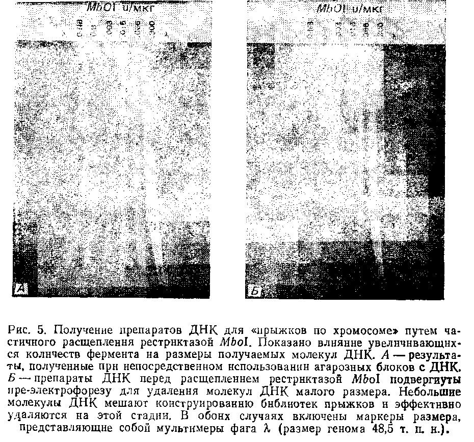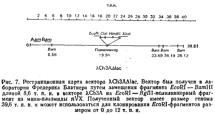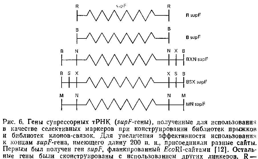 Теоретически подходит любой фаговый вектор, несущий амбер-мутации и клонирующий сайт. Желательно, конечно, чтобы этот вектор обеспечивал максимальную клонирующую емкость. Идеальной можно считать ситуацию, когда кольцевые геномные фрагменты расщеплялись бы лишь частично мелкощепящим ферментом, а затем лигировались в вектор большой емкости, чтобы не было дискриминации фрагментов, обусловленной расположением сайтов рестрикции. Однако обязательные потери, происходящие при частичном расщеплении, оказываются препятствием на пути создания полной библиотеки. Имеющиеся у нас в настоящее время стандартные геномные библиотеки для «прыжков по хромосоме» были получены в результате полного расщепления кольцевых геномных фрагментов рестриктазой EcoRl. Можно использовать и другие ферменты, для которых имеются амбермутантные фаговые клонирующие векторы.