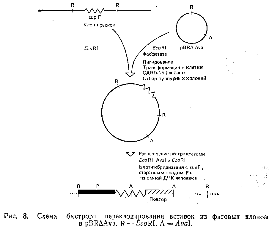 Для того чтобы разделить стартовую и конечную точки прыжка, очень полезно использовать присутствие сайта в центре гена supF. Особенно эффективно это в том случае, когда имеющийся в pBR322 сайт Aval элиминирован. Мы добивались этого, проводя последовательно обработку плазмиды рестриктазой Aval, достраивание фрагментом Клёнова и повторное лигирование. Отделить половины клонированного фрагмента можно, обрабатывая субклоны EcoRl, Aval и обеими рестриктазами одновременно. Лиасайты встречаются иногда в геномных последовательностях, что несколько затрудняет составление карты. Однако при помощи блот-гибридизации рестрицированных субклонов с исходным зондом, supF и геномной ДНК человека, позволяющей локализовать повторы, обычно легко удается построить рестрикционную карту и идентифицировать уникальные последовательности. А это, в свою очередь, позволяет определить, является ли данный прыжок эффективным. Результаты блот-гибридизации представляют особый интерес, так как с их помощью удается идентифицировать ближайшие к супрессорному гену фрагменты.