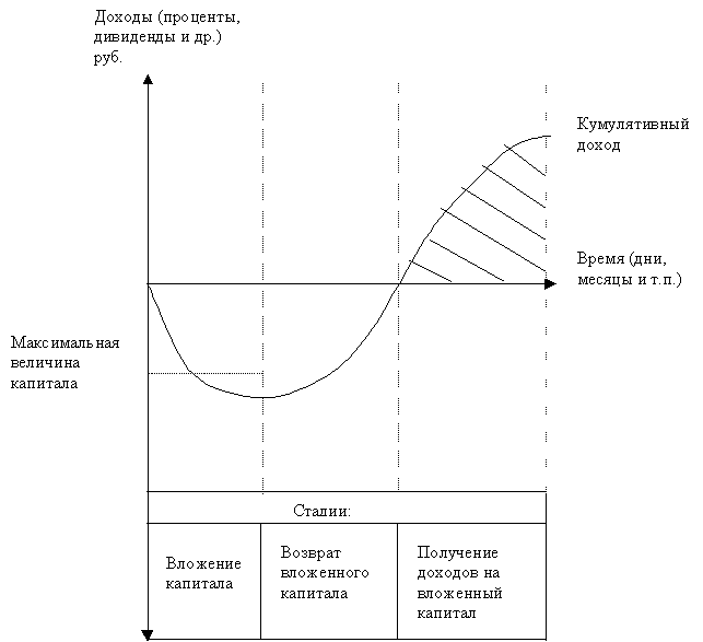Для вкладчика, т.е. для инвестора – продавца, так и для инвестора – покупателя, вложение капитала означает его инвестиционные затраты с целью получения на них доходов. При этом доход на вложенный капитал может образовываться по частям (например, ежедневно, ежемесячно) или сразу целиком (например, через год). Поэтому такой доход можно считать кумулятивным (от лат.cumulatio – увеличение, сложение) доходом.