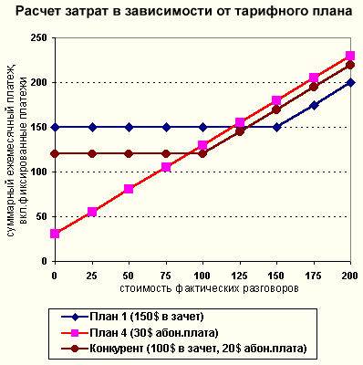 Для каждой категории разработан гибкий тарифный план, определяющий размеры абонентной платы, минимальную сумму счета и тарификацию звонков по Москве. Разработанные схемы скорректированы в отношении тарифов ближайших конкурентов таким образом, чтобы быть чуть привлекательнее. Упрощенный пример анализа тарифных планов представлен на диаграмме (реально расчет затрат гораздо сложнее - необходимо учитывать множество факторов, таких, как структура дальней связи клиента, объемы входящей и исходящей местной связи, оплата дополнительных услуг и т.п.).
