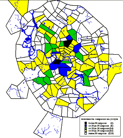 8) картографические данные РАН о Москве, районированные по территории почтовых отделений (плотность населения, распределение потребителей услуг Интернета, распределение промышленных и торговых зон, и т.п.)