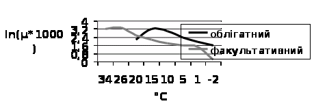 Можна також привести данні про інтенсивність росту у факультативних та облігатних психрофілів, при температурах які прямують до граничних для їх росту. Таким приладом є представлений графік Арреніуса граф. 1.