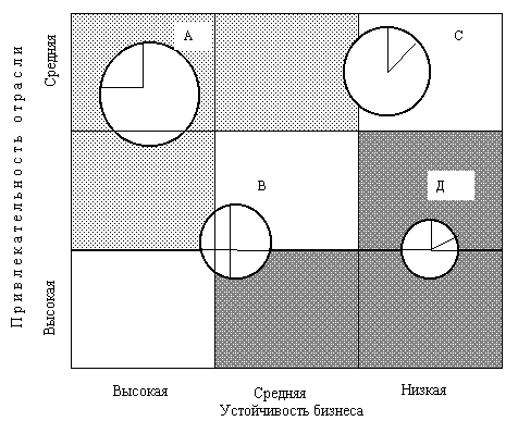 На рис. 1 кружки означают четыре SBU компании, размер круга пропорционален доли отраслей, в которых данные SBU являются конкурентоспособными. Сегмент внутри кружка отражает долю рынка каждого SBU. Например, кружок А обозначает компании с долей рынка 75% в крупной отрасли промышленности с высокой привлекательностью, в которой компания имеет высокую устойчивость бизнеса. Кружок В отражает SBU с долей рынка 50%, однако не в очень привлекательной отрасли промышленности. Кружки С и Д две оставшихся SBU компании в отраслях промышленности, в которых у компании невысокие доли рынка и слабая устойчивость бизнеса.