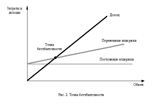 Анализ затрат, объема продукции и прибыли (CVP - анализ) называют анализом безубыточности. Он состоит в нахождении точки на координате объема продукции, соответствующей пересечению прямой общих издержек с прямой дохода от продаж, представлен на рис. 2