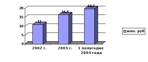 Показатели объема услуг, оказанных населению туристскими фирмами Чувашской Республики, за первое полугодие 2004 года превысили годовой показатель 2003 года. Так, если за 2003 год объем оказанных туристских услуг туристическими фирмами в 1,5 раза превысил показатель 2002 года и составил более 16,5 млн. рублей, то полугодовой показатель 2004 года уже превышает годовые итоги на 3,47 млн. рублей, что на 16% выше итогов прошлого года (диаграмма 1).