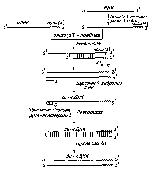 Рис. 3. Схема синтеза двухцепочечных ДНК-копий молекул РНК