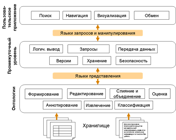 Промежуточный уровень обеспечивает хранение онтологий и метаданных, управление версиями, доступом, передачу данных для взаимодействия с внешними системами и хранилищами, обработку запросов и логический вывод.