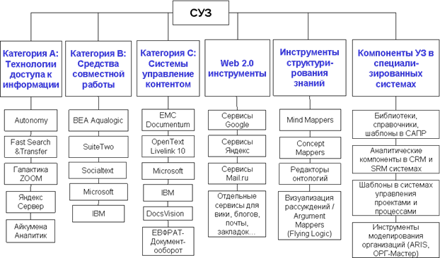 Существуют различные классификации технологий УЗ [Marwick, 2001; Мильнер и др., 2006; Davies et al, 2005], например, в [Гаврилова, 2008], все инструменты СУЗ разбиты на 7 классов: