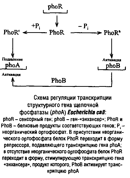 Продуктами генов – «энхансеров» являются белки с молекулярной массой 25–30 кДа, способные связываться с промоторной областью. Как правило, такая система двухкомпонентна и включает «сигнальный» белок, способный «чувствовать» изменение условий окружающей среды и стимулировать синтез другого белка – «активатора», который и запускает транскрипцию искомого белкового посредника.