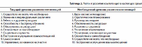В табл.2 приведен рейтинг текущего уровня развития компетенций по мнению респондентов и рейтинг компетенций, необходимый для максимальной эффективности и успеха в современных условиях.